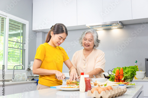 Senior asian mother and middle aged daughter cooking together at kitchen