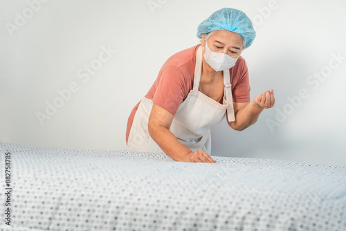 Senior Asian woman housemaid cleaning a room, Chambermaid making bed, Housekeeper cleaning room, woman changing bedding