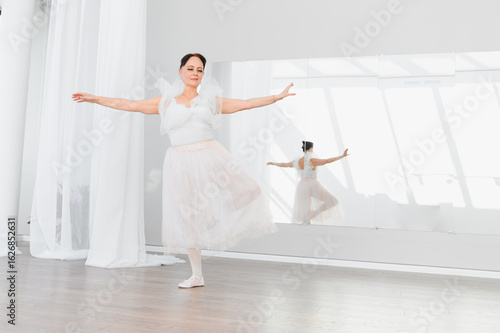 Senior ballerina practicing classical dance in white dress in front of mirror