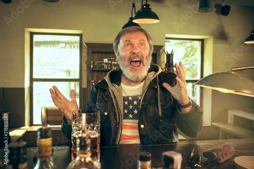 Senior bearded man drinking alcohol in pub and watching a sport program on TV. Enjoying my favorite teem and beer. Man with mug of beer sitting at table. Football or sport fan. Human emotions concept