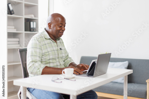 Senior businessman sitting alone in his home office and working on laptop computer. Smiling black man using laptop in living room. Businessman using phone laptop at home.