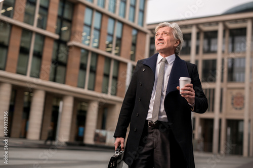 Senior businessman with briefcase and plastic glass with hot drink hurrying for work in the morning