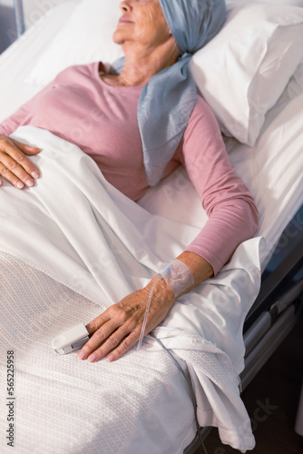 Senior caucasian female cancer patient wearing head scarf in bed with pulse oximeter at hospital