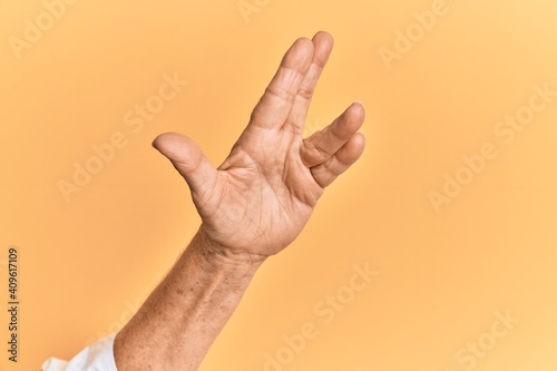 Senior caucasian hand over yellow isolated background greeting doing vulcan salute, showing hand palm and fingers, freak culture