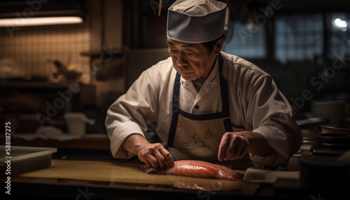 Senior Caucasian male chef expertly preparing homemade meat generated by AI