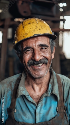 Senior construction worker wearing a yellow hardhat and smiling in a workshop environment, showcasing job satisfaction and workplace positivity