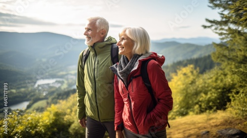 Senior couple admiring beauty of nature the scenic hiking during their active retirement.