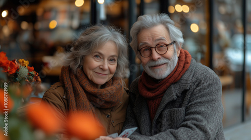 Senior couple enjoying a cozy moment together outside a cafe during autumn in a lively urban setting. Generative AI