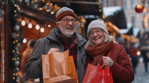 Senior couple, man and woman having fun shopping, shopping bags