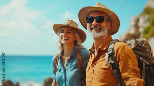Senior couple on vacation, reflecting a modern, active lifestyle with stylish clothing and gear..