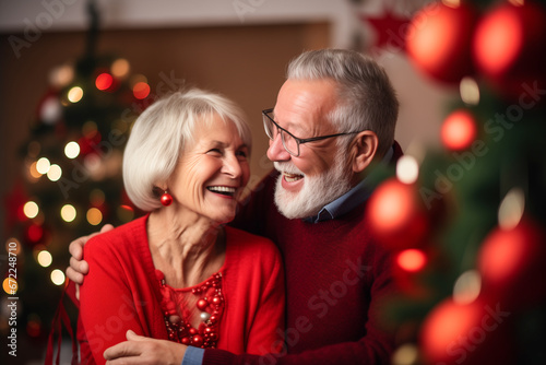 Senior couple sitting in the living room together during Christmas. Senior couple having fun spending winter holiday season together at home.