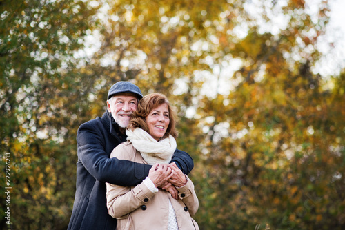 Senior couple standing in an autumn nature, hugging.