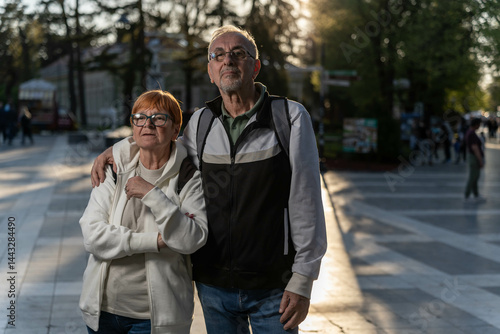 Senior couple walking in the park during springtime at sunset. Peaceful romantic moment outdoors, enjoying nature and each other’s company.