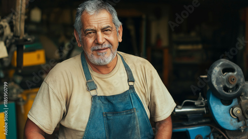 Senior craftsman in workshop wearing denim apron. Perfect for traditional manufacturing, skilled trades, and artisanal expertise themes.