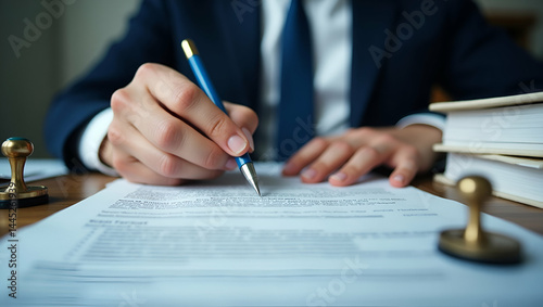Senior Executive Completing Tariffs Calculation at Workstation with Trade Agreements Books and Official Stamps - Professional Business Concept with Empty Space