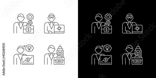 Senior executive roles linear icons set for dark and light mode. Chief Executive Officer. Main company position. Customizable thin line symbols. Isolated vector outline illustrations. Editable stroke