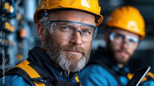 Senior Experienced Electrician Demonstrating and Explaining Electrical Circuit Wiring and Components to His Coworker Team on an Industrial Construction Site