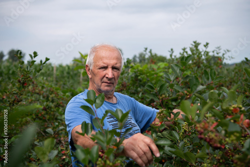 Senior Farmer Carefully Inspecting His Blueberry Farm to Ensure Quality and Progress