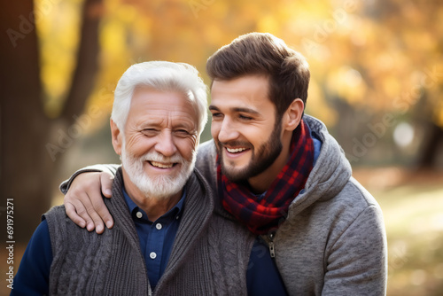 Senior father spending time with his adult son walking in the park. A man hugs his elderly father, relaxation and lifestyle after retirement concept