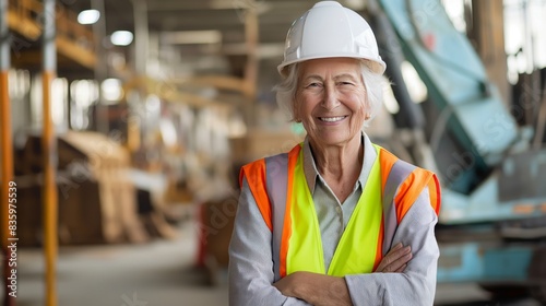 Senior Female Construction Worker Smiling and Wearing Hard Hat and High Visibility Vest in Industrial Background for Workplace Diversity Promotion