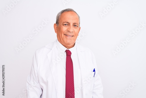 Senior grey-haired scientist man wearing coat standing over isolated white background with a happy and cool smile on face. Lucky person.