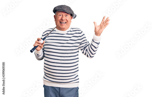 Senior handsome grey-haired man holding golf club and ball celebrating victory with happy smile and winner expression with raised hands