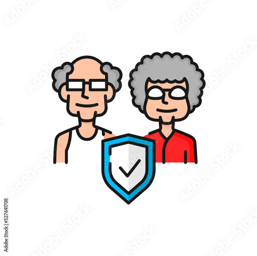 Senior health insurance line icon, vector isolated elderly people and shield. Retirement symbol, old couple man and woman under healthcare protection