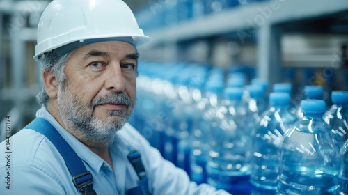 Senior male engineer, industry professional, hard hat inspector inspects water bottle system in warehouse at industrial plant, on beverage production line.