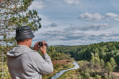 Senior male hiker who is admiring landscape and filming with video camera. Nature park Deer streams
