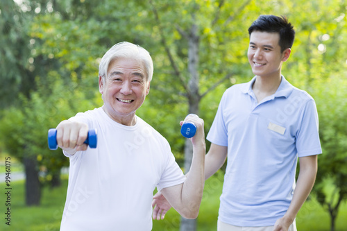 Senior man exercising with dumbbell in nursing home