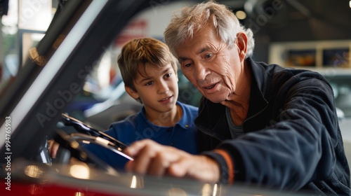 Senior man explaining the mechanics of a vintage car to a teenage boy