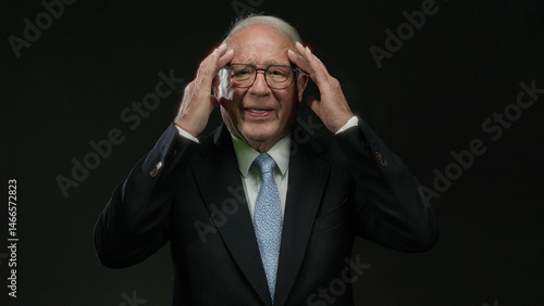 Senior man in a business suit isolated over a black background, expressing emotions and gestures.