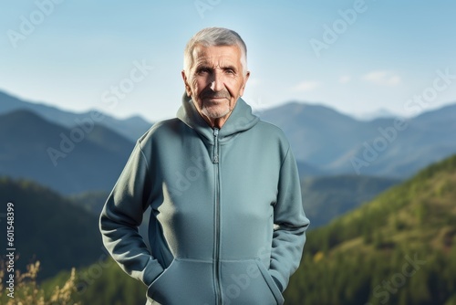 Senior man in sportswear standing on top of mountain and looking at camera