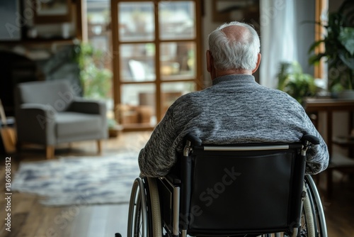 Senior man in wheelchair against modern home interior with ample copy space for text or design