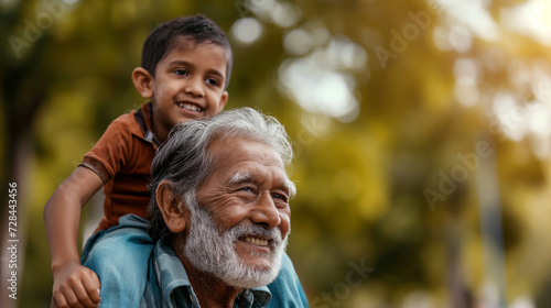 Senior man joyfully carrying his grandson on shoulders at an Indian park, creating special memories