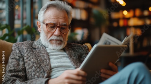 Senior man reads digital newspaper on tablet Stay informed and engage with the world through modern technology.