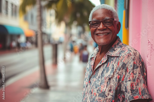 Senior man smiling in vibrant downtown Miami on a sunny day