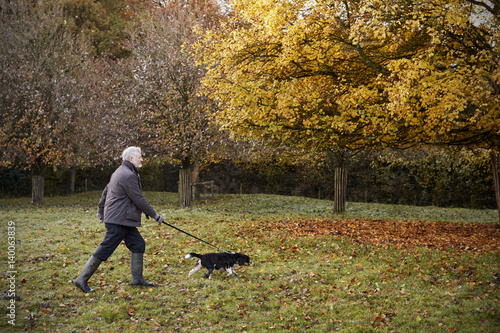 Senior Man Taking Dog For Walk In Autumn Landscape