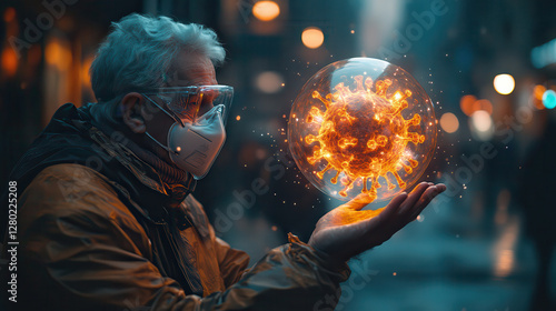 senior man wearing protective face mask and goggles stands dimly lit urban street, holding glowing, fiery orb resembling virus. scene is dramatic and surreal, highlighting themes of health and