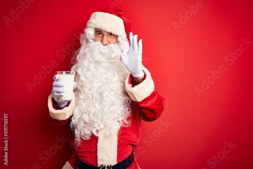 Senior man wearing Santa Claus costume holding glass of milk over isolated red background doing ok sign with fingers, excellent symbol