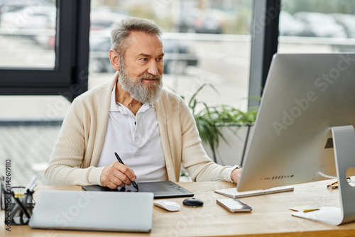Senior man with a beard engages in digital work at a spacious office desk with plants.