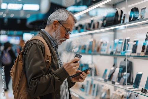 Senior man with a curious gaze, perusing the display of travel gadgets and accessories at an airport electronics store, eager to enhance his journey with the latest tech innovations
