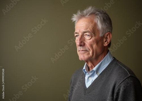 Senior man with contemplative expression gazing thoughtfully against olive background with copy space
