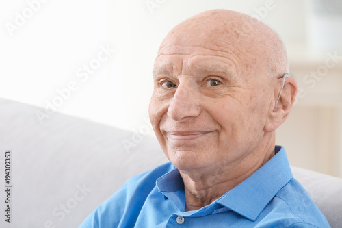 Senior man with hearing aid indoors