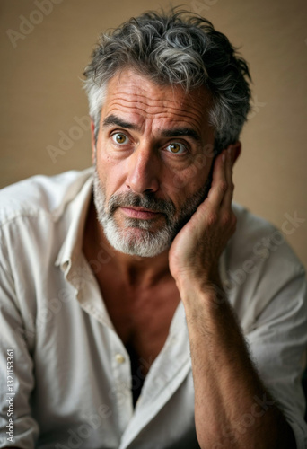 Senior man with serious expression, grey hair, profound gaze.