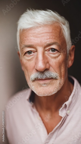 Senior man with white hair and mustache in pink shirt, gazing at camera in studio with light background. Perfect for professional headshots, elderly portrait prints, or high-quality profile photos