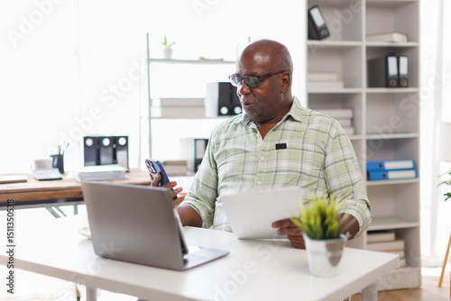 Senior man working with papers and Laptop in workplace reading Documents, enjoying eemote work and Business on retirement.