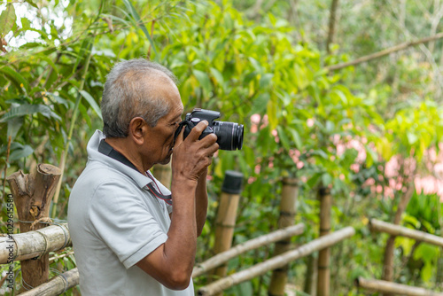 Senior nature photographer on mountain - professional photographer taking photos of nature in the forest