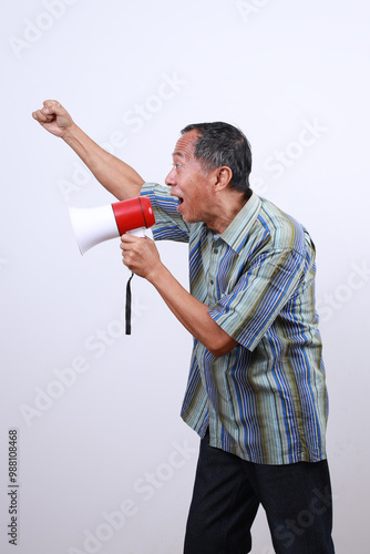 Senior old man scream in loudspeaker while raising fists isolated on white background