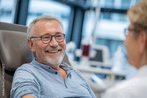 Senior patient smiling during consultation with female doctor in modern clinic